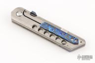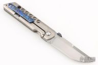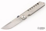 This framelock by Billy Cho Knives features a hand rub satin finished blade with a notched thumbrest and a black timascus thumbdisc. The handle has a "Frosted Ti" finished titanium frame with a Black Timascus tip up clip and floating backspacer. Nice detent, lockup and blade seating, rides on phosphor bronze washers. Comes with a zippered case. Excellent condition.