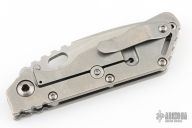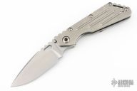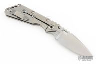 This Mick Strider Performance Series SMF framelock folder features a spear point 3/4 grind blade with thumbhole and notched thumbrest. The handle has a stonewashed titanium frame with titanium clip, tip up carry. Jimping on blade spine. Includes Hinderer "Lock Bar Stabilizer" for maximum reverse lock retention. Nice detent, lockup and blade seating. Excellent condition.
