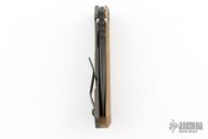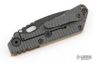 This SNG framelock folder by Mick Strider features a black blade and a Monkey Edge frag pattern G-10 and flame finished titanium frame and tip up titanium clip. Includes a "Lock Bar Stabilizer" for maximum reverse lock retention. Nice detent, lockup and blade seating. Excellent condition.