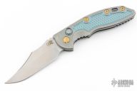 This XM-18 Flipper by Rick Hinderer Knives features a 3.5" stonewashed finish blade, notched thumbrest and flipper.  The handle has a stonewashed and two-tone anodized titanium frame with brass hardware and matching tip up pocket clip. Comes with original box and papers. Excellent condition.