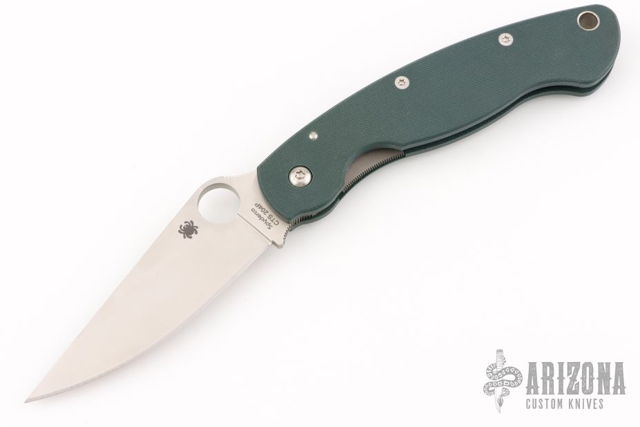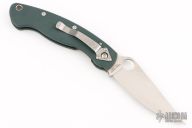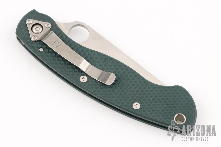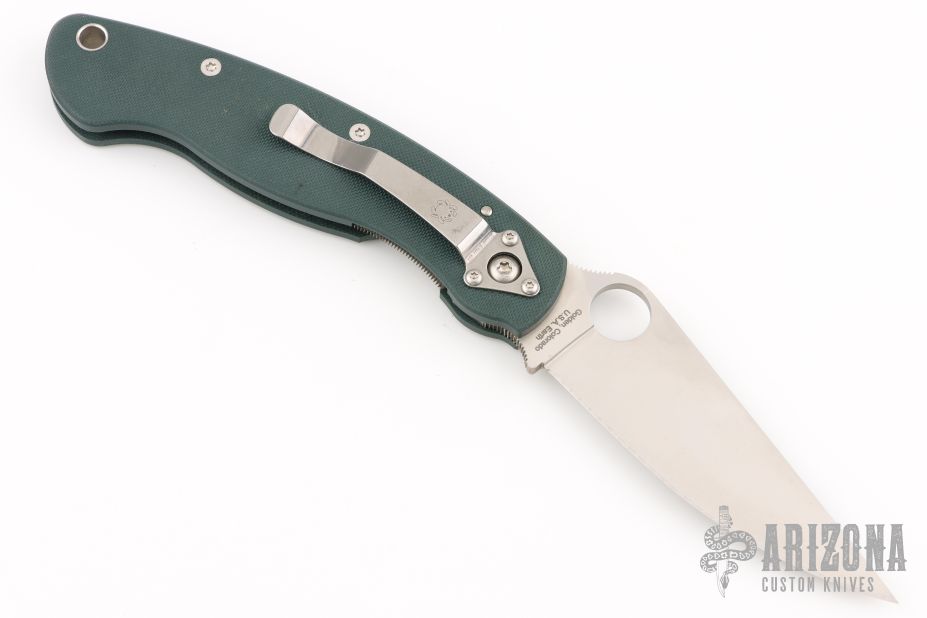 This C36GPGR Military from Spyderco was an exclusive configuration done for Knifeworks. It features a satin finish full flat ground clip point blade with thumb hole and notched thumb rest. The handle is comprised of green peel-ply textured G10 scales over skeletonized stainless steel liners. Stainless steel tip down clip and steel lanyard tube in pommel. Includes original box and paperwork. Excellent condition.