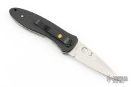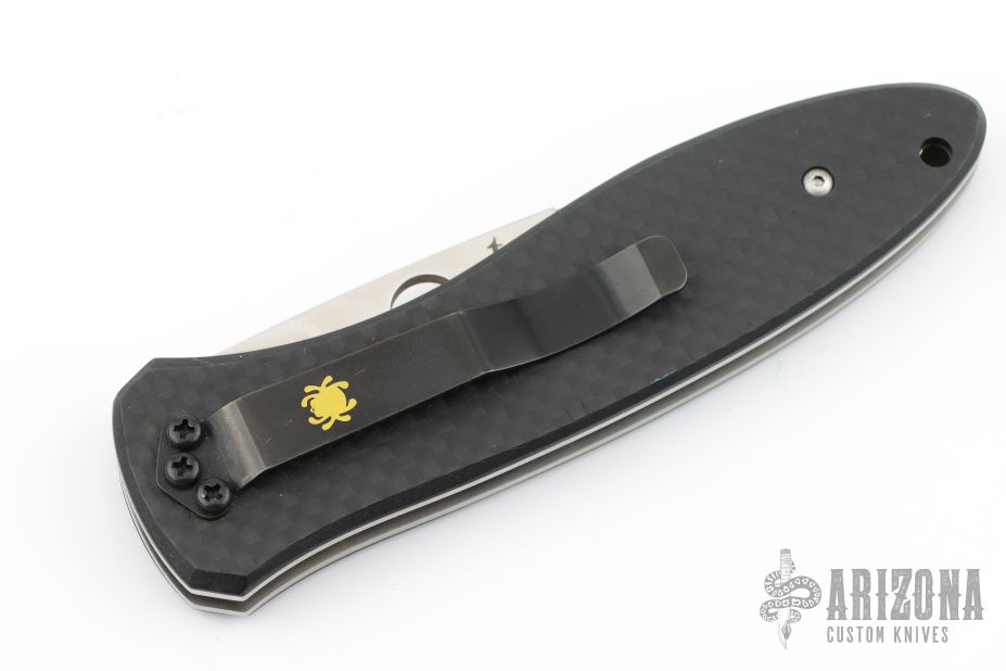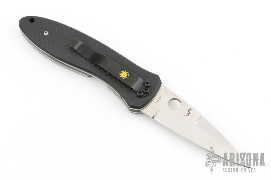 This C56FP from Spyderco features a drop point blade with false top edge and spyderco thumb hole. The handle is comprised of carbon fiber scales over stainless steel liners and barrel spacers. Lanyard hole in pommel. Tip down carry stainless steel pocket clip. Comes with original box and papers. Has a couple light scuffs and scratches on the clip. Excellent condition otherwise.