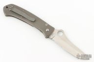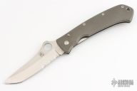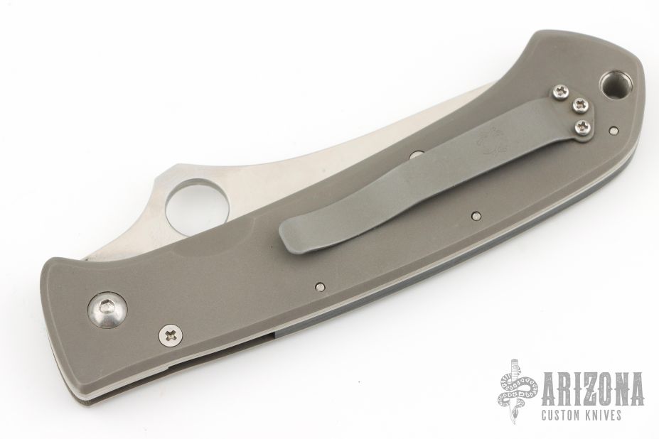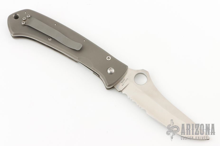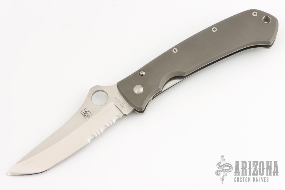 This Bob Lum designed folding knife by Spyderco features a tanto partially serrated blade marked with the Lum Logo.  The handle features titanium scales and a bead blasted tip up/down pocket clip, single stainless steel liner, black backspacer. Nice detent, lockup and blade seating. Comes with original box and papers. Has a couple light scuffs and scratches, excellent condition otherwise.