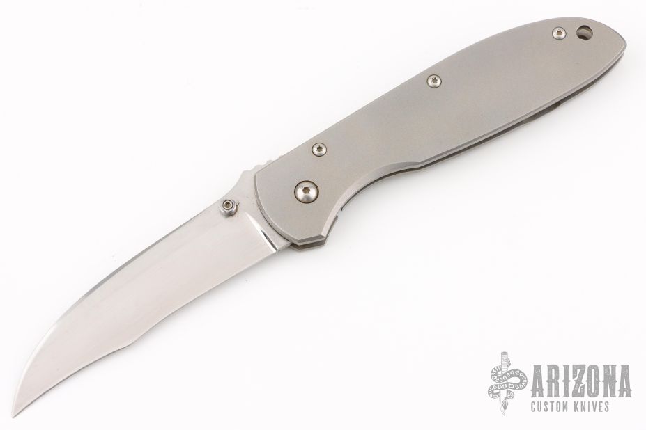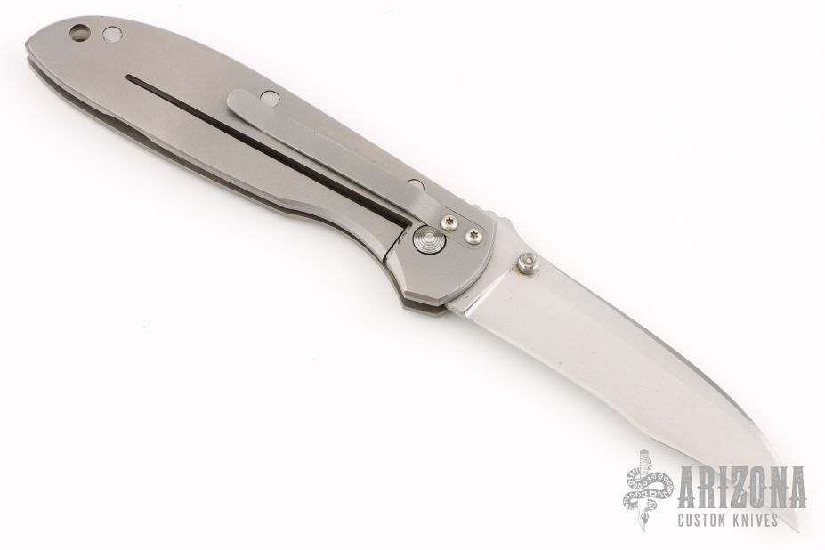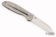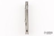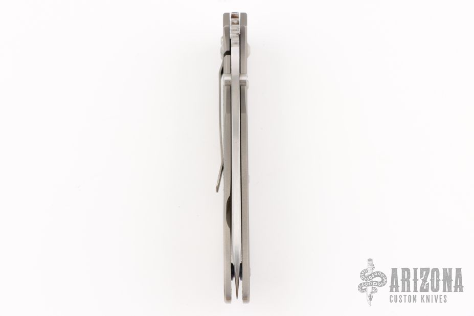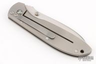 This FireTac framelock folder by Rick Hinerer features a hand rub satin finish blade with dual thumbstuds and notched thumb ramp. The handle is made from titanium, with tip down titanium clip. Has anodized standoffs, and lanyard hole in pommel. Comes in a zipper case. Has some light scuffs, and scratches, excellent condition otherwise, and for its age. Blade marked "R.Hinderer".