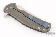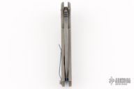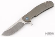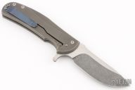 This Ferox by Ferrum Forge features a two-tone blade with satin finished flats and tumbled grinds, notched thumbrest and flipper. The handle is tumble finished titanium with blue anodized pivot, tip up clip and barrel spacers. Features internal over travel stop in the stainless steel lockbar insert. Nice detent, lockup and blade seating. Includes maker's zipper case with dogtag attached. Has a couple light scuffs, otherwise Excellent condition.