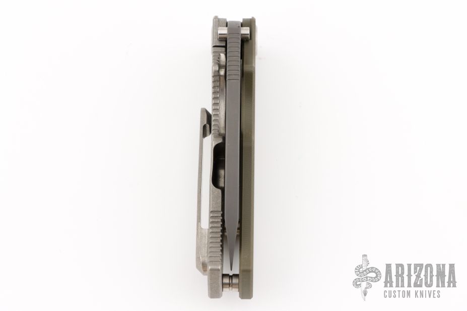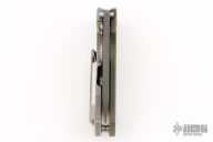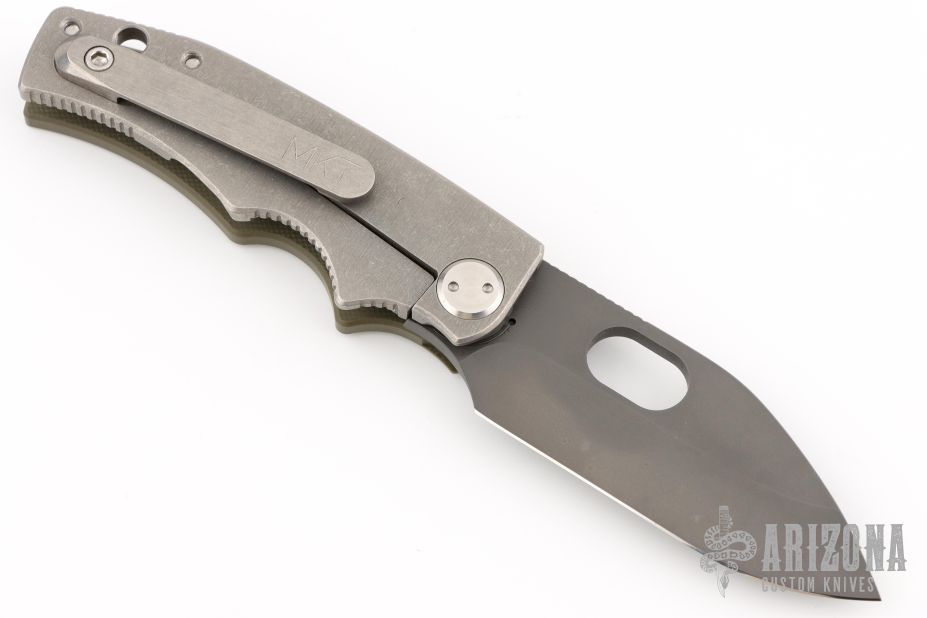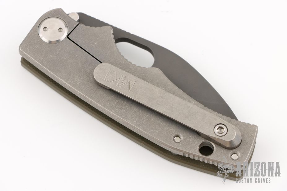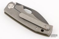 This 187RMP by Medford Knife features a gray PVD coated blade with thumbhole and notched thumbrest. The handle has a green G-10 and tumbled titanium frame with matching tip up clip. Nice detent, lockup and blade seating. Comes with original box and papers. Has some light scuffs, excellent condition otherwise.