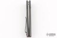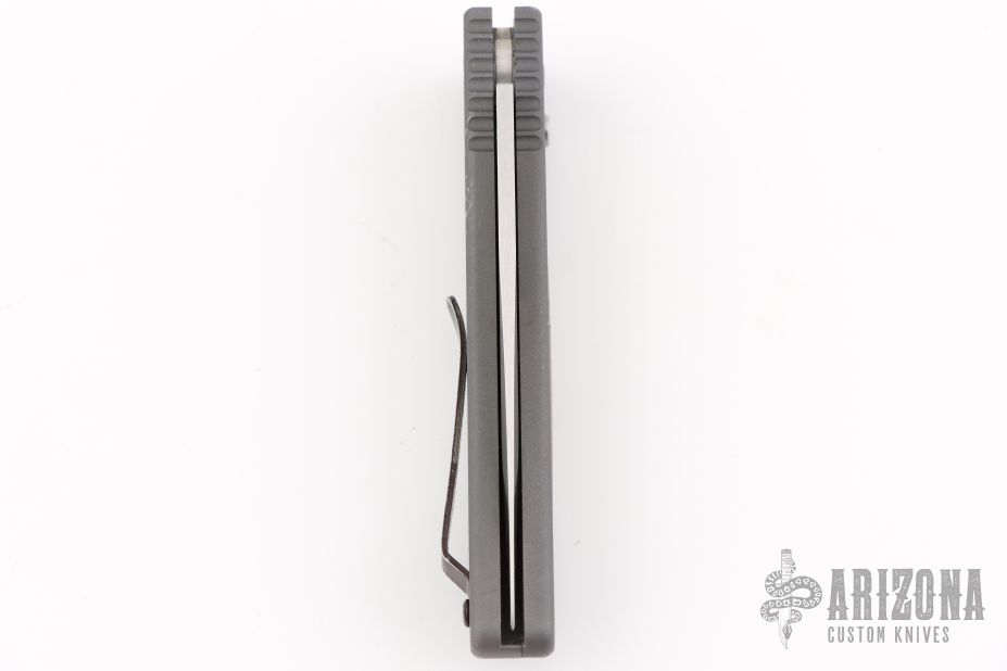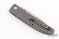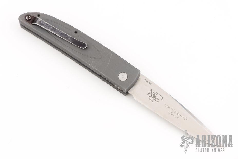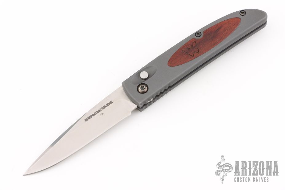 The 3200 automatic is a Mel Pardue design. Side opening, coil spring automatic. Polished tumble finish blade. Grey aluminum handle with Winewood inlay. Black stainless steel clip. Sliding safety. Blade marked "20/25 ". Comes with original box and papers. Has scuffs and scratches on the frame, clip and blade. Good condition otherwise.