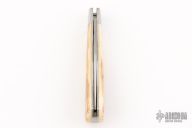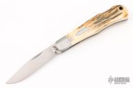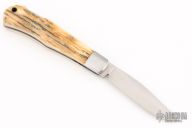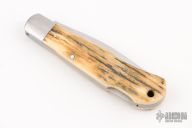 This lockback by Bobby Toole features a hand rub satin finished blade with nail nick. The handle has satin stainless steel bolsters, mammoth ivory covers with stainless steel escutcheon, stainless steel liners and steel spring. Smooth action. Comes in maker's zipper case and with COA. Has a couple light scuffs and scratches, excellent condition.