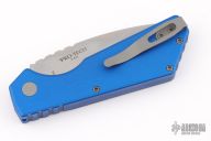 This Pro-Strider PT by Pro-Tech and Strider Knives features a stonewashed blade with notched thumbrest. The handle has a blue aluminum frame with black hardware and black stainless steel tip up clip.  Black push button. Comes with original box and papers. Excellent Condition.
