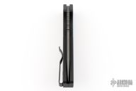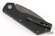 This Pro-Strider PT by Pro-Tech and Strider Knives features a Smokey Grey DLC blade with notched thumbrest. The handle has a black aluminum frame with black hardware and black stainless steel tip up clip.  Black push button. Comes with original box and papers. Excellent Condition.