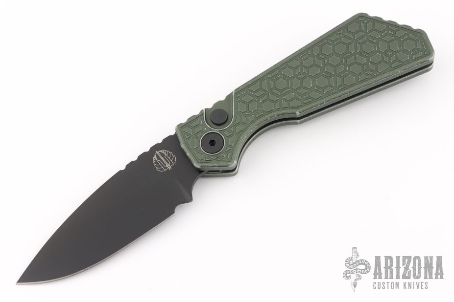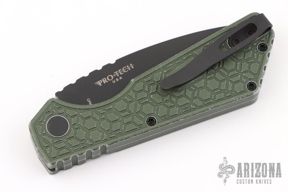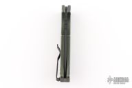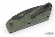 This Pro-Strider PT by Pro-Tech and Strider Knives features a Black DLC blade with notched thumbrest. The handle has a "Gridlock" battleworn green aluminum frame with black hardware and black stainless steel tip up clip.  Black push button. Comes with original box and papers. Excellent Condition.
