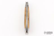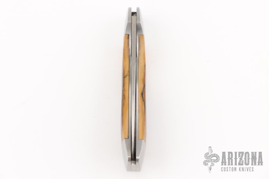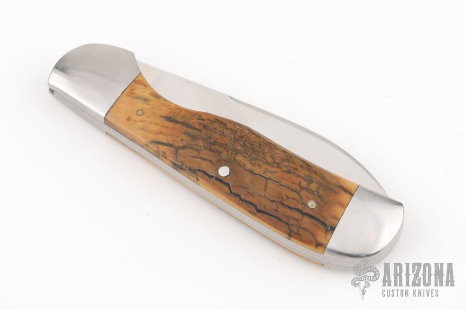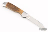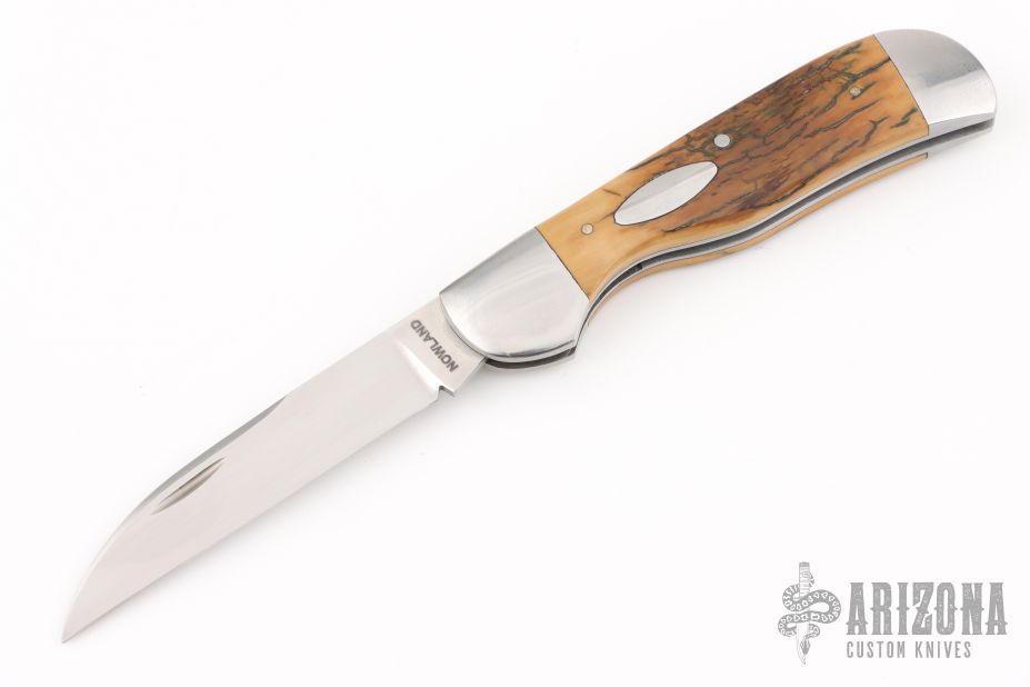 This Slipjoint by Rick Nowland features a wharncliffe blade with hand rub satin finish and nail nick. The handle is stainless steel with integral liners, stainless escutcheon, Mammoth ivory covers, and stainless spring. Has half-stop, flush in all positions. Comes in a zipper case. Has some light scuffs and scratches, excellent condition otherwise.