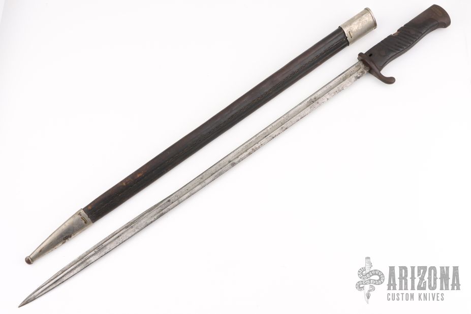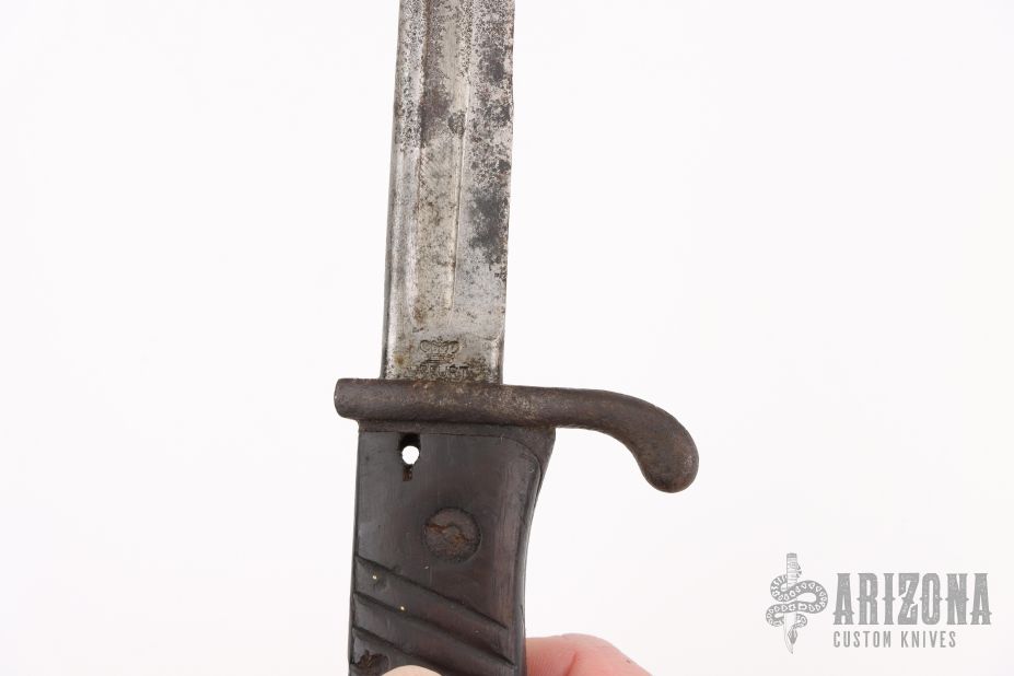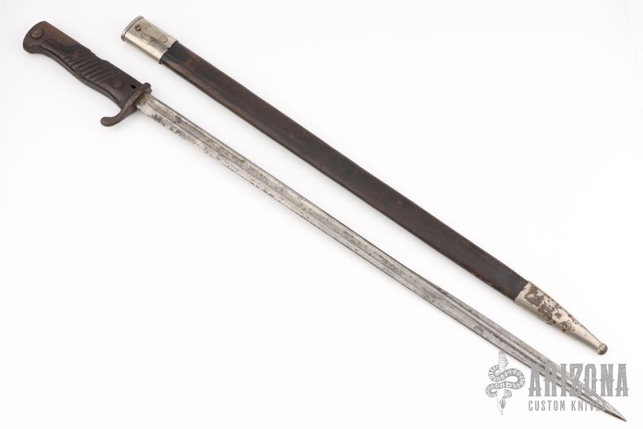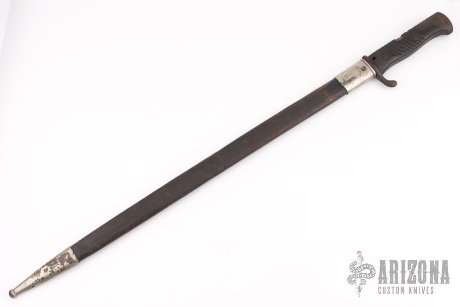 This bayonet is a rare example of the first model of this bayonet, the a.A. (alter Art) model produced until 1902, and the grip is made of two pieces of wood on either side of the tang. After the turn of the century the Germans simplified and strengthened their bayonet grips. The original "neu Art" (new type) bayonet had the more standard two grip scales on either side of the tang. For more information please see Watts & White, The Bayonet Book, page 119, Item 256.