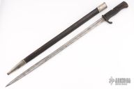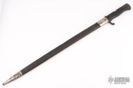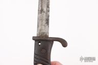 The bayonet shows overall light corrosion and staining on the blade, as well as some dings in the edge, however it is overall quite nice after years of service. The grips has some chips missing, otherwise good condition, and the carved ribs still clear. The hilt does have some corrosion, so this is definitely a bayonet that saw a lot of service. The bayonet comes complete with its original steel fitted leather scabbard, which looks to have nickel plated fittings.