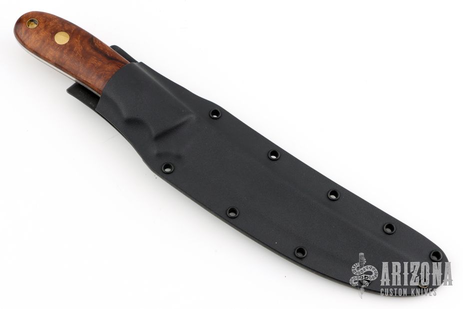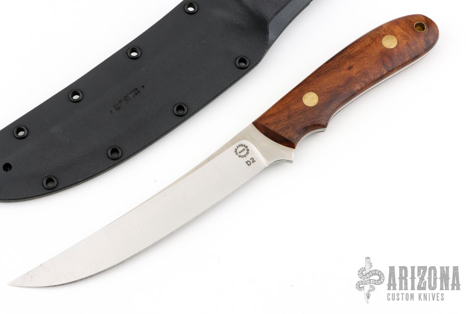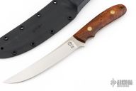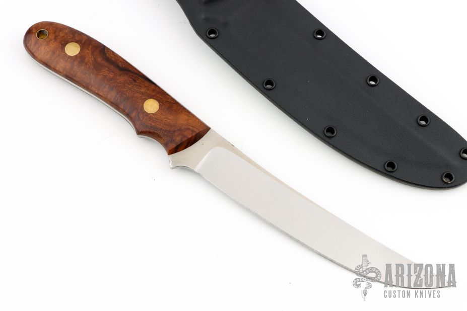This K-23 Fillet by Dozier Knives features a satin finished blade, .116" blade stock and .926" blade depth, full tang construction. The handle has ironwood scales with brass pins and lanyard hole. Comes with kydex sheath with belt loop. Has some light scuffs, excellent condition otherwise.