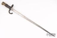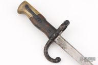Standard Gras pattern complete with functional spring lock. 20 ⅝” T back blade marked Mre d’ Armes de St Etienne Feirier 1878. Stamps on blade are "M" inside a circle and "M" with a crown on top in a circle. The guard has some stamps, but it has oxidation so you can't make them out. The handle has two-piece wood scales with brass butt and functional spring lock. Has scratches and oxidation. Good condition for a nearly 150 year old item.