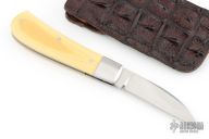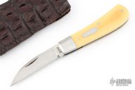 This Slipjoint by Jim Dunlap features a wharncliffe blade with a hand-rubbed satin finish and nail nick. The handle has Westinghouse paper micarta covers with stainless bolsters, escutcheon, liners and spring. Comes in an alligator leather slip sheath. Has a couple light scuffs, otherwise Excellent condition.