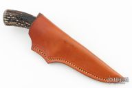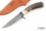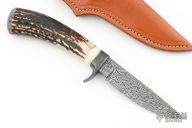 This hunter by Master Smith Aaron Wilburn features a Mosaic Damascus drop point blade, .157" blade stock and .956" blade depth, hidden tang construction. The handle has a wrought iron guard and butt, stag grip with fossil walrus ivory and nickel silver spacers. #892 on the blade. Comes with a 8-9 oz Wickett & Craig brown leather sheath. New from maker!