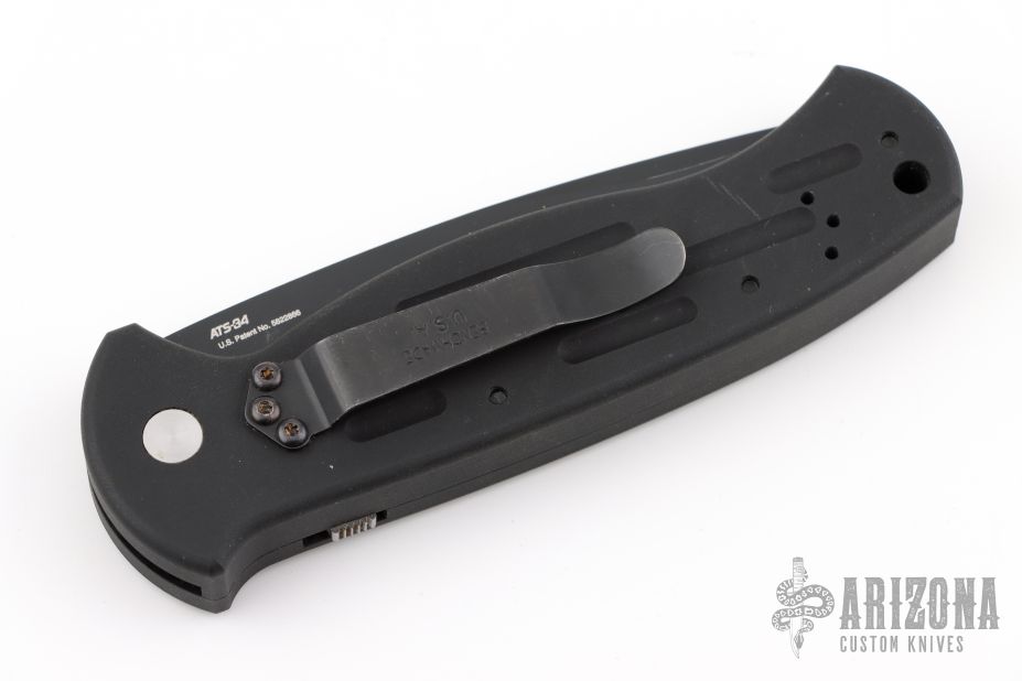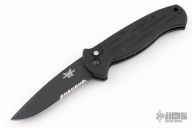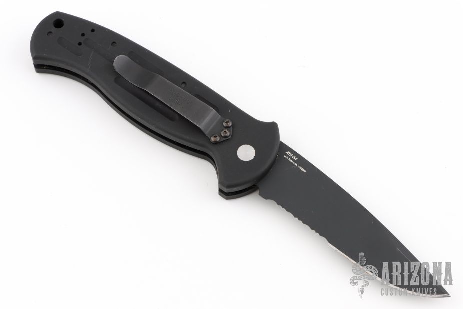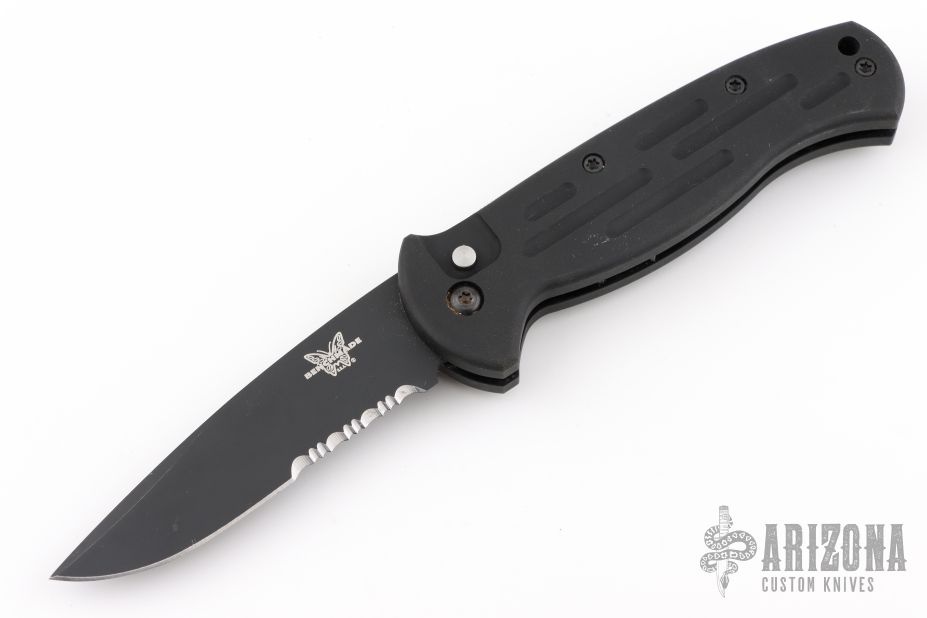This Early AFO Automatic from Benchmade features a black drop point blade with swedge and partial serrations. The handle is comprised of black aluminum with a lanyard hole in pommel. Comes in a nylon/velcro Benchmade belt sheath. Has a couple light scuffs and scratches, great condition otherwise.