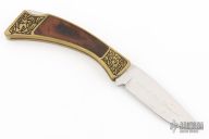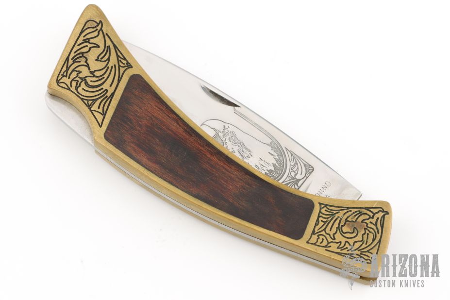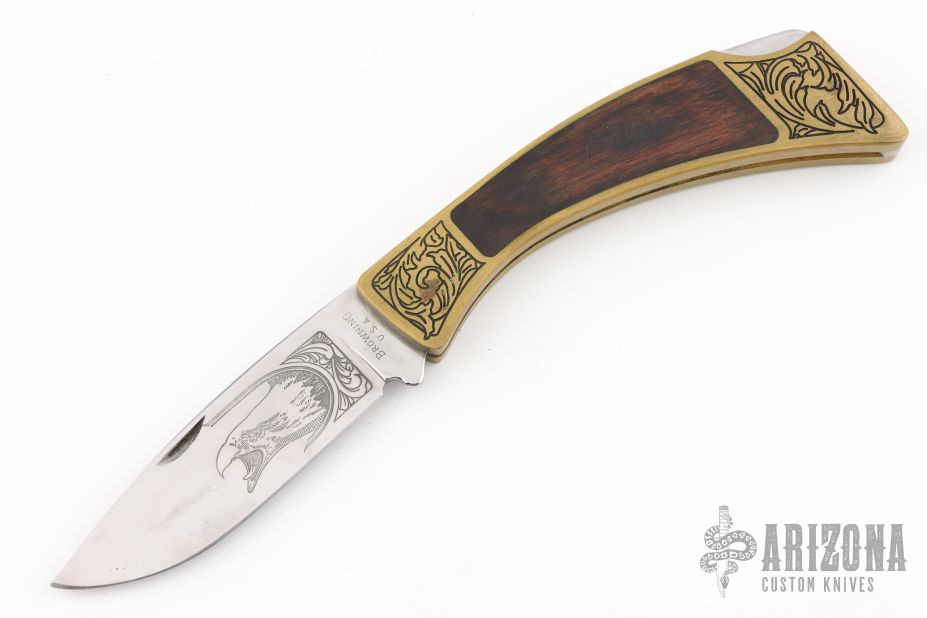 This lockback folder by Browning features a mirror polished blade with nail nick and etching. The handle has a brass frame with wood inlays and a stainless steel backspacer. Engraved bolsters. Has some scuffs and patina, otherwise excellent condition.