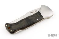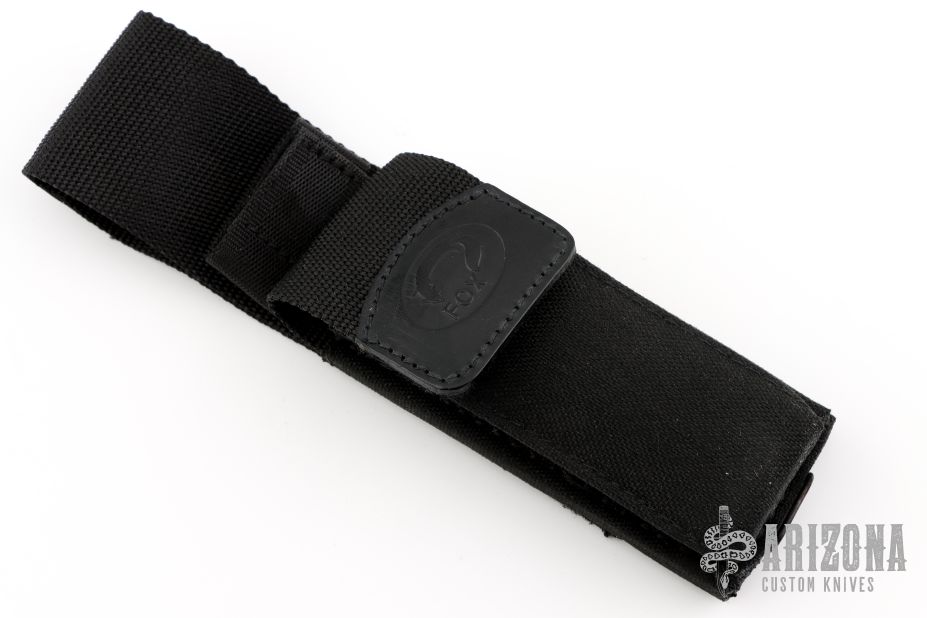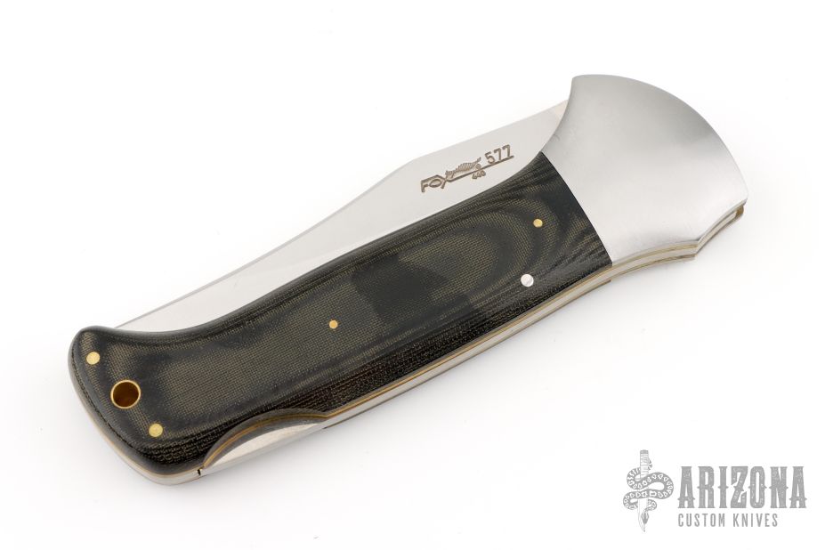 This lockback by Fox Cutlery has a satin finished blade. The handle has stainless steel bolsters, black linen micarta scales, brass liners and a stainless steel backspacer. Comes with original box and nylon sheath. Excellent condition.