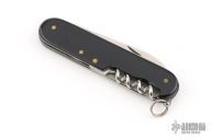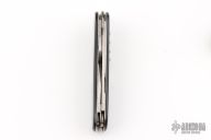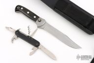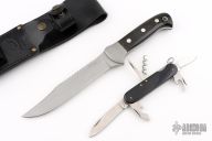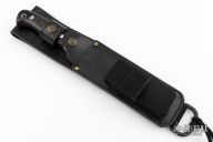 This knife by Fox Cutlery features a bead blast finished clip point blade with saw teeth, swedge, .143" blade stock and 1.113" blade depth, full tang construction with titanium bolsters, micarta covers, and lanyard hole in pommel. On the rear side of the knife there is a button that snaps the knife into the leather sheath. Comes with original sheath. Has some scuffs and light scratches, otherwise excellent condition.