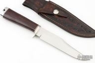 This knife by Daryl Hibben features a mirror polished blade with .193" blade stock and 1.214" blade depth, full tang construction. The handle nickel silver guard, and butt, as well as micarta grip and red spacers. Lanyard hole in pommel. Comes with a hand tooled brown leather sheath. Has a couple light scratches, otherwise excellent condition.