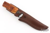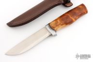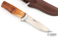 This GT by Helle of Norway features a scandi ground drop point laminated steel blade with .125" blade stock and 1.137" blade depth. The handle is comprised of an aluminum guard with black fiber and aluminum spacers and curly birch handle over hidden tang construction. Includes leather sheath with belt loop and original packaging. Excellent condition.