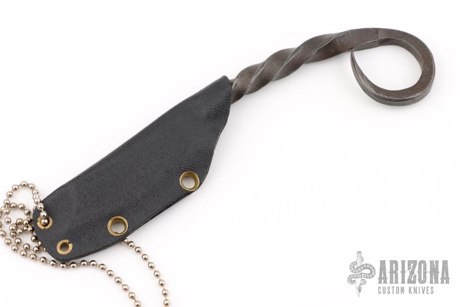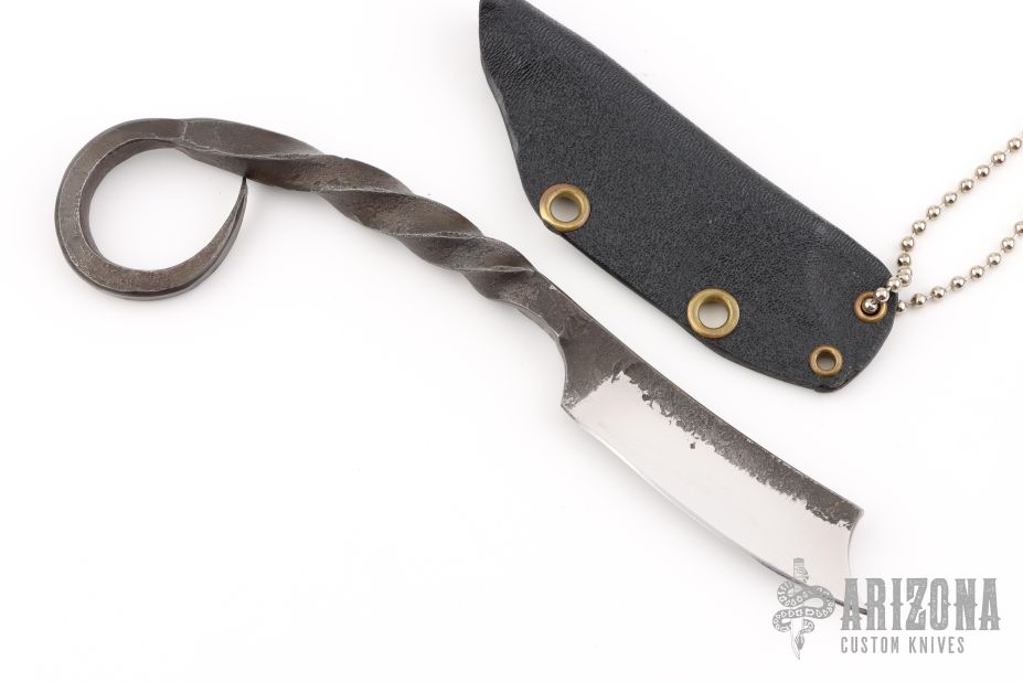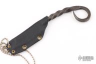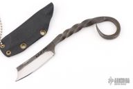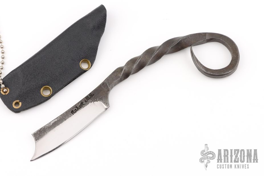 This knife by Master Smith Ray Kirk of Raker Knives features a hand forged blade with integral handle, .170" blade stock and .772" blade depth, full tang construction with a twisted grip. Comes with a Kydex neck sheath. Has some sheath scratches, otherwise excellent condition.