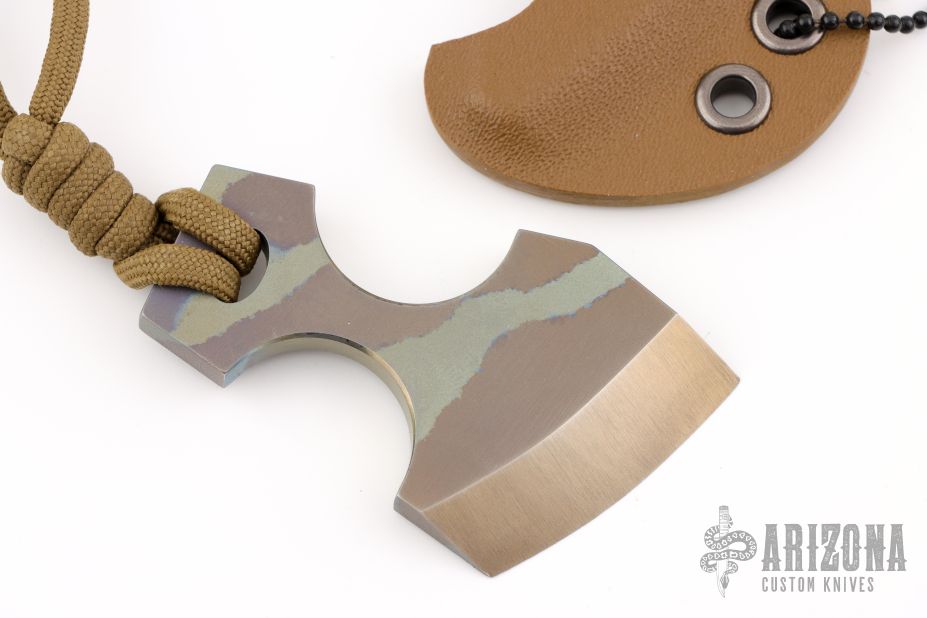 Designed to be a small cutting tool or a backup defensive weapon that is easily carried anywhere, this spunk from Mummert Knives delivers an amazing amount of cutting ability in a small package. The Spunk is constructed out of .195” thick 6Al-4V titanium with tungsten carbide fused to the edge attaining a rockwell hardness of 72 at the razor sharp edge. Stripe anodized finish with a 1200 grit satin bevel. Comes with a custom Kydex neck sheath with double chain holes for twist-free wear. Excellent condition. Comes with original packaging.