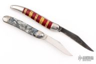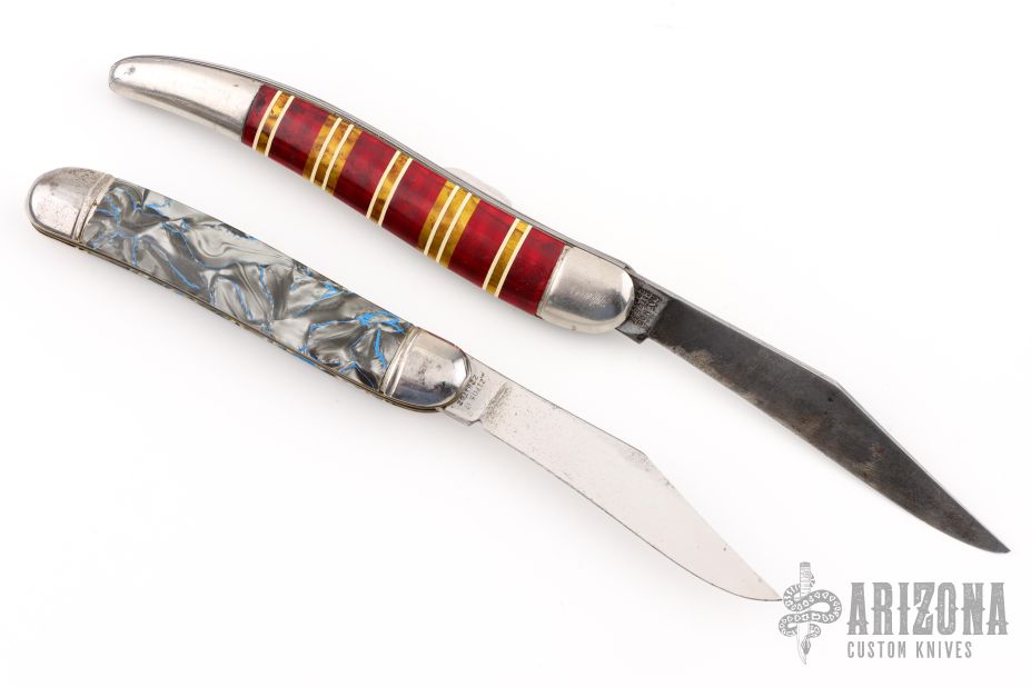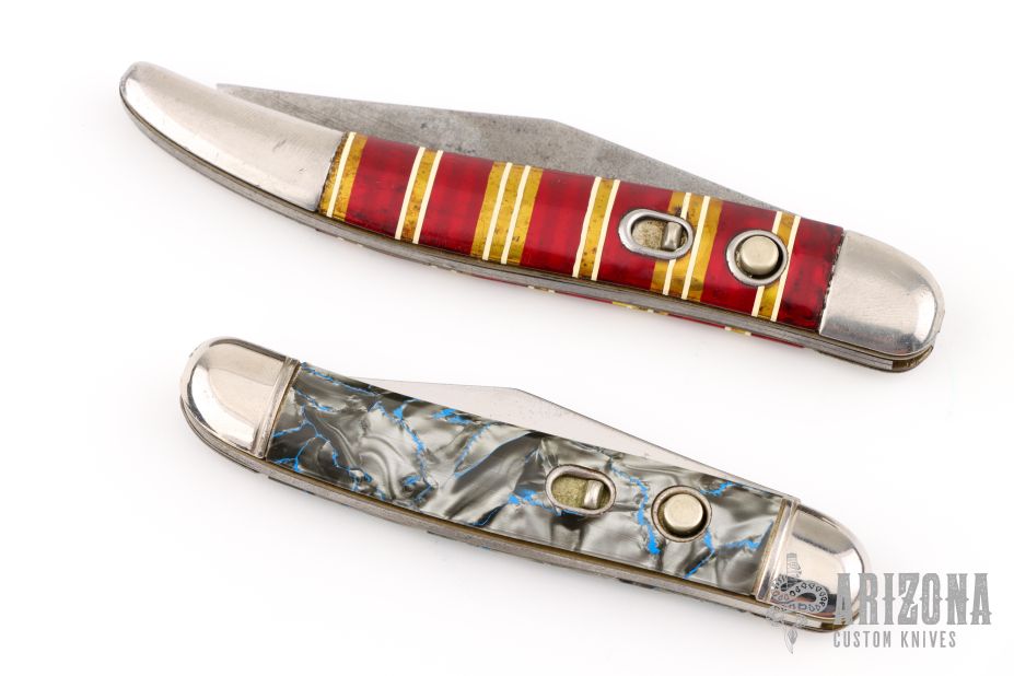 This Antique auto by Hammer Brand features a clip point blade. The handle as stainless steel bolsters front and rear, candy stripe scales, brass liners and steel backspacers, has safety. Has some patina and scratches, has been resharpened, has some blade play, otherwise good condition for its age.
