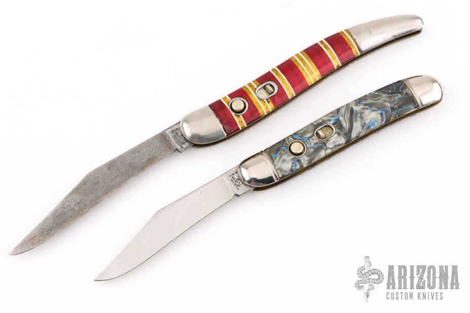This Antique auto by Hammer Brand features a clip point polished blade. The handle as stainless steel bolsters front and rear, acrylic scales, brass liners and steel backspacers, has safety. Has some patina and scratches, has some blade play, will only stay closed if you use the safety, otherwise good condition for its age.