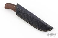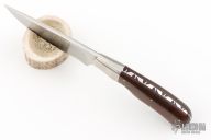 This hunter by Theuns Prinsloo features a hand rub satin finished blade with mirror polished flats, .15" blade stock and 1.188" blade depth, full tapered tang construction. The handle has satin stainless bolsters, wood scales, with red and black liners. File-worked tang. Comes with a leather sheath. Has a couple light scuffs and scratches, otherwise Excellent Condition.