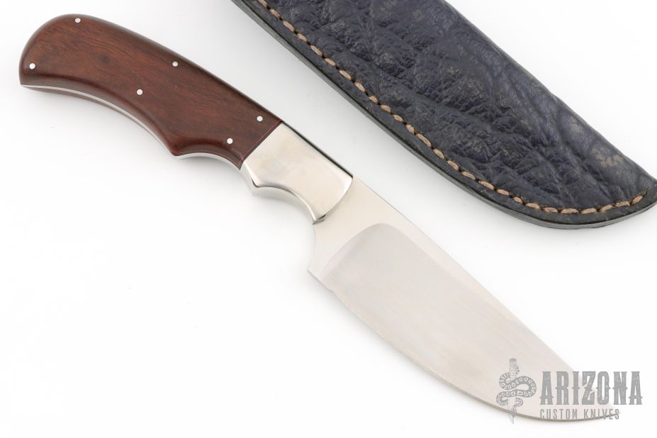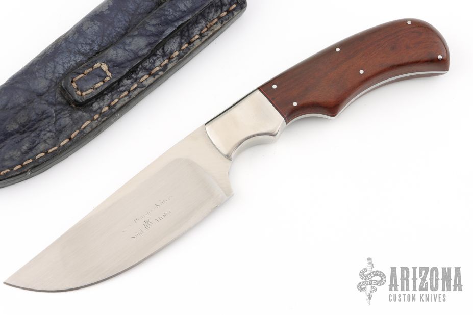 This hunter by Theuns Prinsloo features a hand rub satin finished blade with mirror polished flats, .15" blade stock and 1.188" blade depth, full tapered tang construction. The handle has satin stainless bolsters, wood scales, with red and black liners. File-worked tang. Comes with a leather sheath. Has a couple light scuffs and scratches, otherwise Excellent Condition.