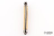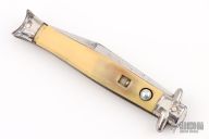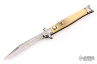 This Colonial Sabre Auto by Shur-Snap features a satin finished sabre blade. The handle has stainless steel bolsters and acrylic scales with steel liners. Has blade play, has some scratches and oxidation spots, otherwise good condition for its age.