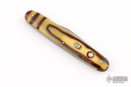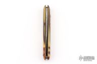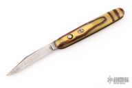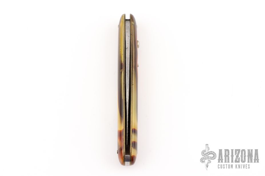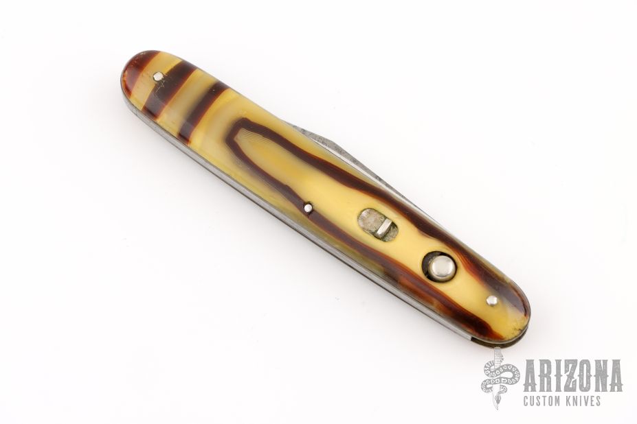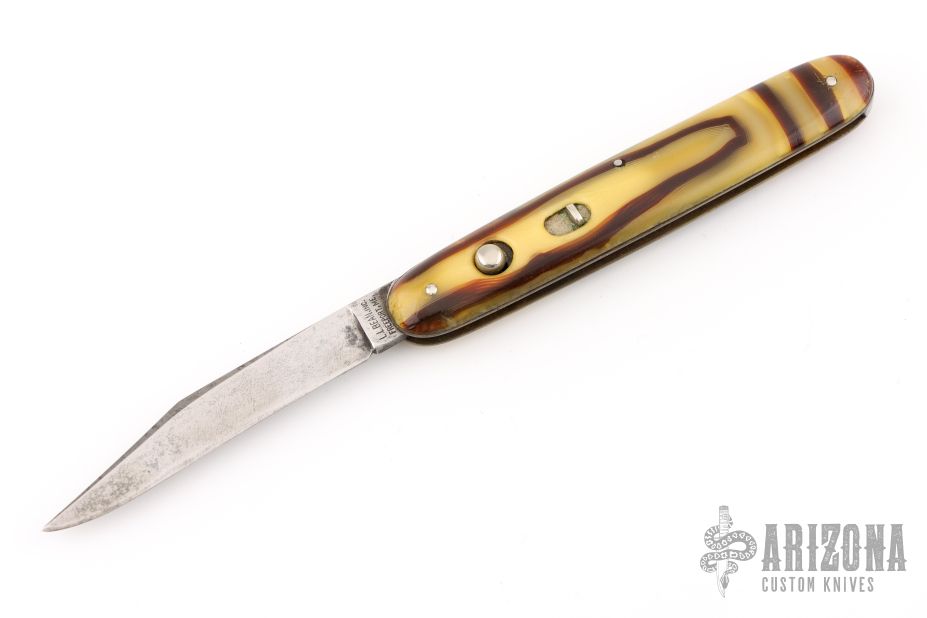 This antique auto by LL Bean features a satin finished blade. Has celluloid scales with brass liners and steel backspacer. Has some scratches and patina on the blade. Has safety. Good condition for its age.