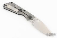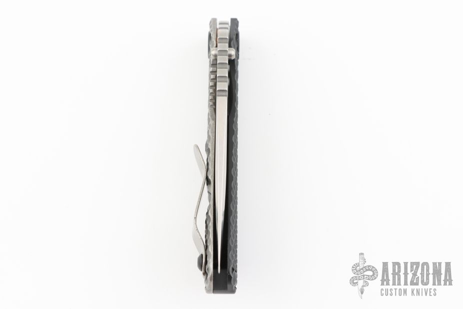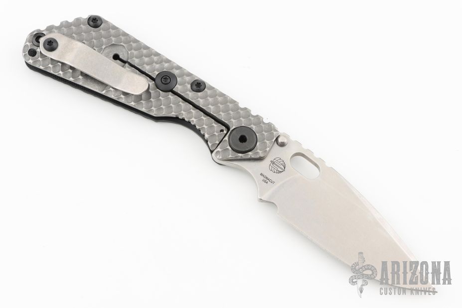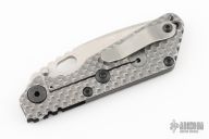 This SNG DGG by M Strider has a stonewashed blade with dual thumb studs, thumbhole, and notched thumbrest. Handle is black G-10 and bead blasted titanium "Gunner Grip", lockbar stabilizer, and titanium tip up clip. Nice detent, lockup and blade seating. New condition.