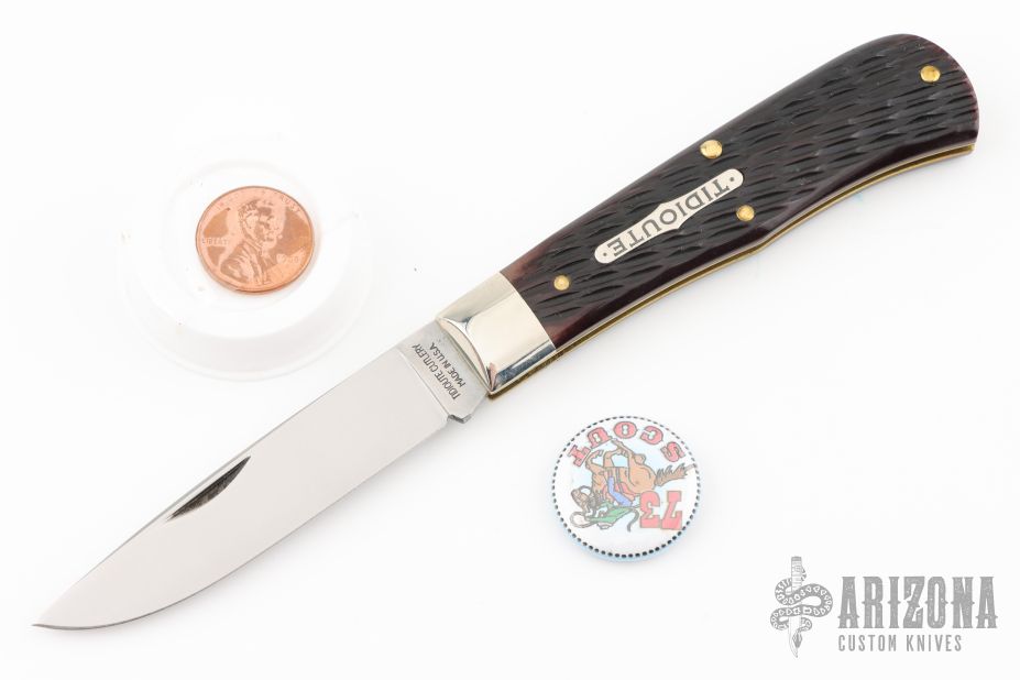 This knife by Great Eastern Cutlery features a satin finished blade with nail nick. The handle has nickel silver bolsters that are pinched, nickel silver escutcheon, brass liners/pins, Black Box Brown Jigged Bone covers. Has half-stop. Comes with original tube. Excellent condition. 68 made