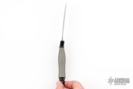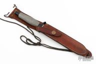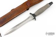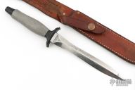 This 20th Anniversary Mark II #XX4952 has a satin finished stainless steel double-edged blade with hidden tang. Blade stock is .238", depth is .932". Handle is Grey "Cat's Tongue" textured aluminum with black double guard and black butt cap - with lanyard hole. Comes with original brown leather sheath. This model has a 5 degree cant on the blade so it rides closer to the body during carry. Has scuffs, scratches, oxidation and some light rust spots. Fair condition.