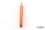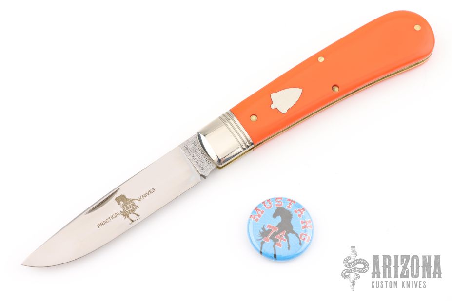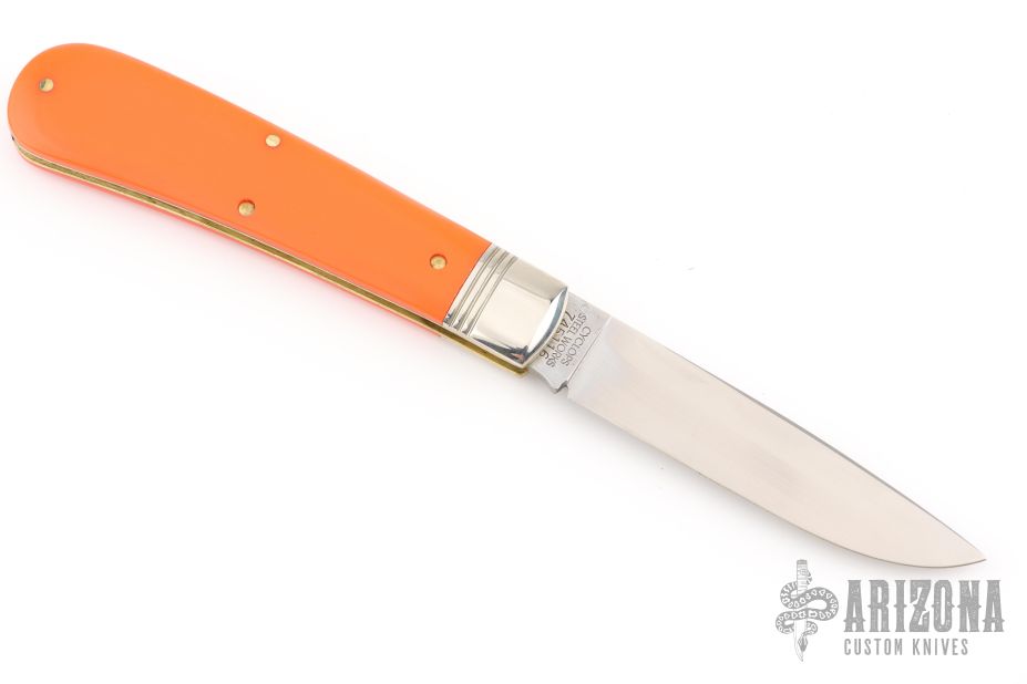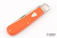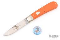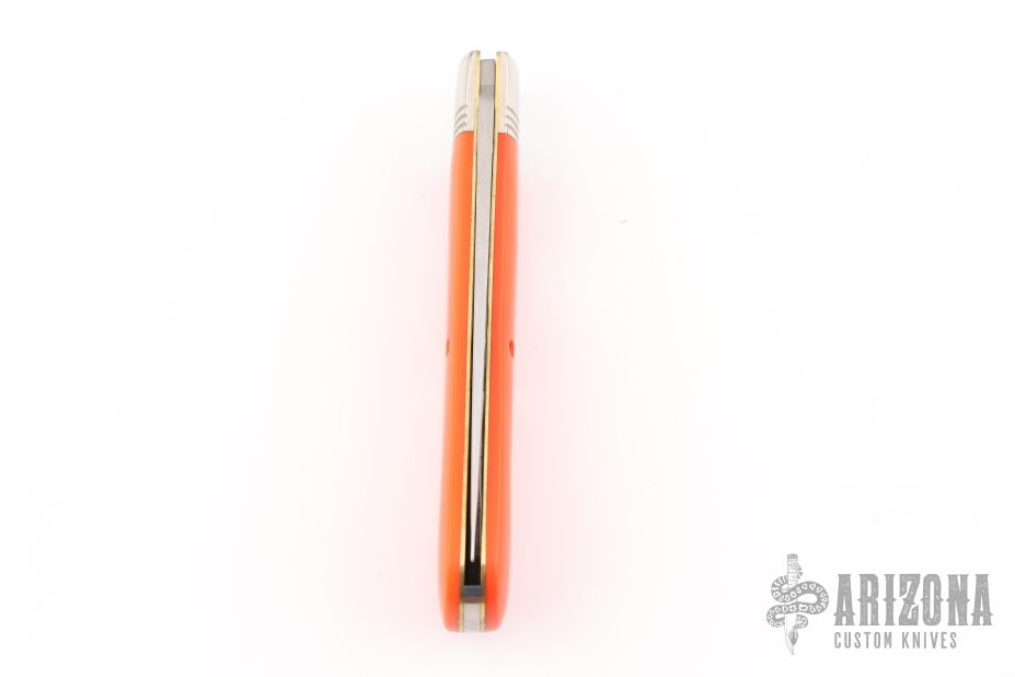 This knife by Great Eastern Cutlery features a satin finished blade with nail nick. The handle has nickel silver bolsters that are pinched and fluted, brass liners, orange Delrin covers. Has half-stops. Comes with original tube. Excellent condition. 47 made