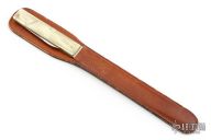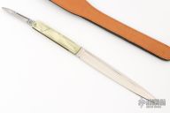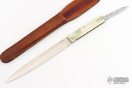 This sheath knife by Pal Cutlery features a mirror polished dagger blade with pinned pearlex handle with brass liners and steel spring. Comes with a leather boot sheath. Hidden blade is 2.25", with long pull. Has some scuffs, scratches, and patina. Good condition otherwise.