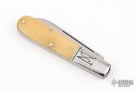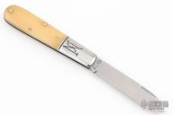 This slipjoint by Great Eastern Cutlery features a satin finished blade with a nail nick. The handle has fluted stainless steel bolsters, brass liners, smooth ivory bone covers, stainless steel spring. Has half stop. Comes with original tube. Excellent condition. 116 made