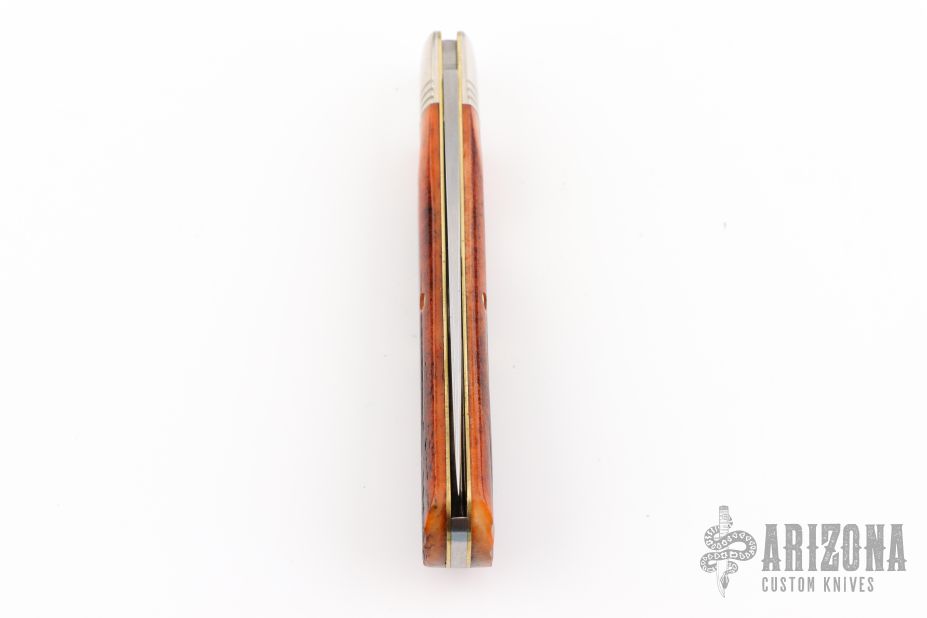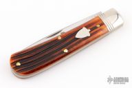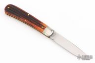 This knife by Great Eastern Cutlery features a satin finished blade with nail nick. The handle has nickel silver bolsters that are pinched and fluted, brass liners, burnt orange jigged bone covers. Has half-stops. Comes with original tube. Excellent condition. 117 made