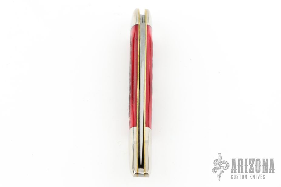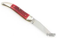 This Toothpick by Great Eastern Cutlery features a satin finished blade with nail nick. The handle has nickel silver bolsters, blood red jigged bone covers, brass liners, and a stainless spring. Comes with original tube. Excellent condition. 100 made