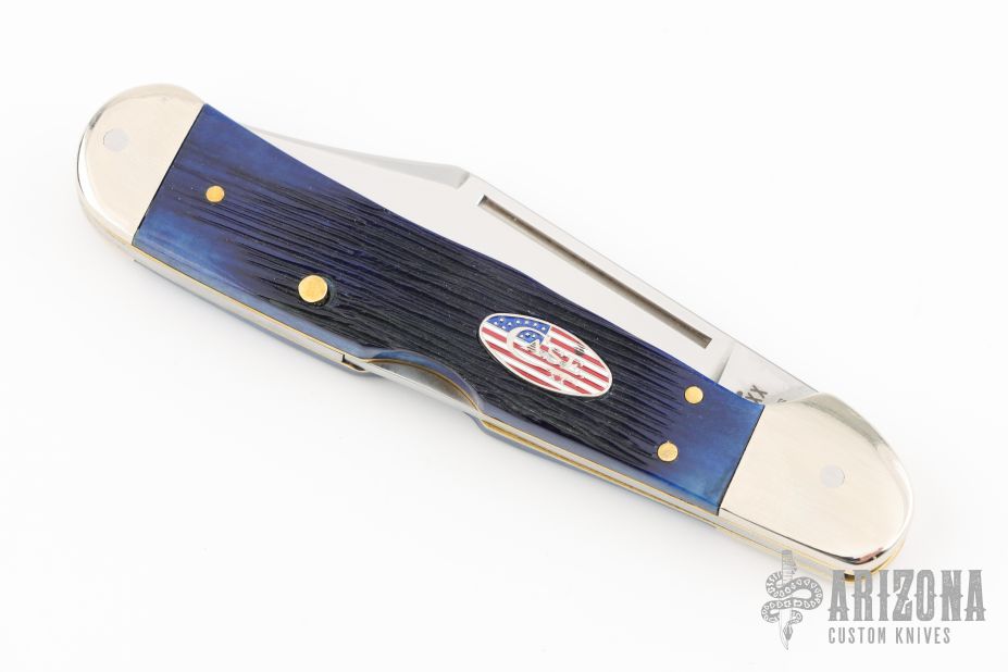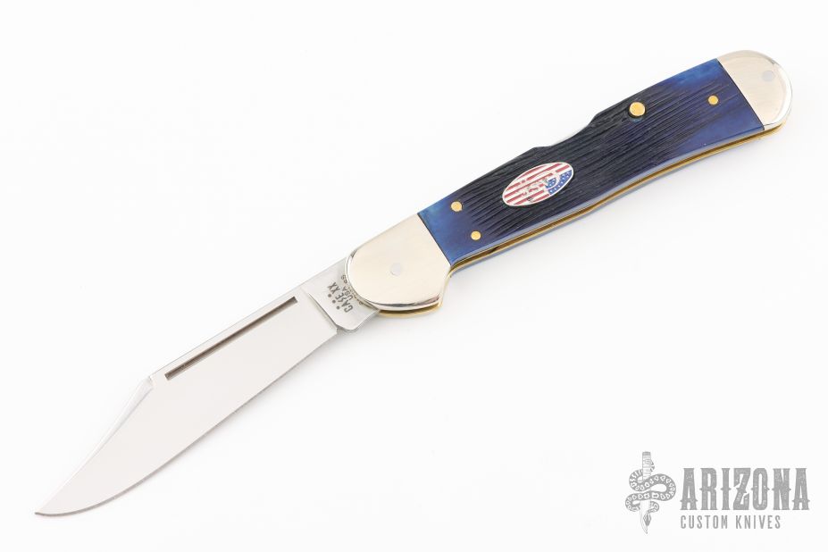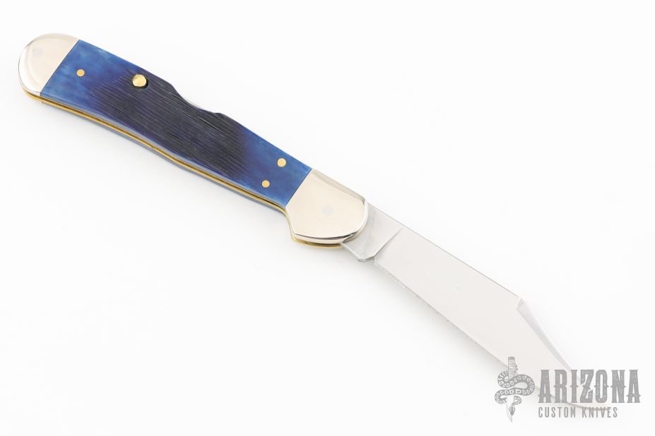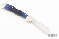 This Mini Copperlock by Case Knives has been converted to a dual action automatic by Alex Shunnarah. It features a polished clip point blade with swedge and long pull. The handle is comprised of nickel silver double bolsters and blue bone scales over brass liners and a stainless steel backspring. Comes with original box and papers. Excellent Condition.