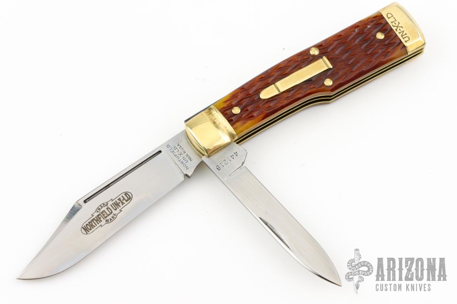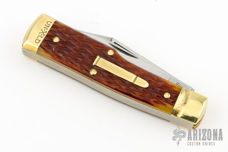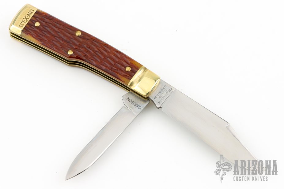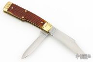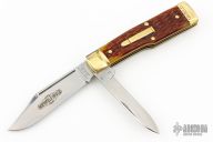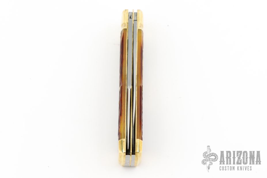 This slipjoint by Great Eastern Cutlery features two satin-polish finished blades with nail nicks.  The handle features fluted brass bolsters, brass liners and autumn gold jigged bone covers. Steel springs. Comes in original tube. Excellent condition.