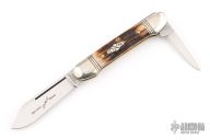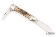 This slipjoint from Great Eastern Cutlery features two polished blades with nail nicks. The handle has nickel silver bolsters and  amber jig bone covers with nickel silver escutcheon, brass liners and steel backsprings. Includes original packaging. Has scuffs, scratches, and patina. Great condition otherwise. #37 on bolster.