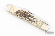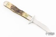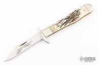This D/A Auto Conversion Cheetah lock back folder from Case Knives features a clip point mirror polished blade with nail nick and fileworked spine. The handle has nickel silver bolsters, front and rear, and swing guard, and the scales are white bone over brass liners, fileworked stainless steel backspacer. Includes the original box and papers. Excellent Condition.