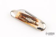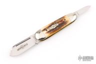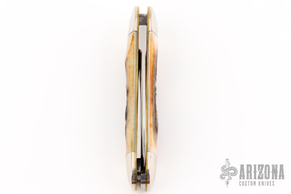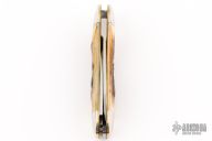 This slipjoint from Northfields features two mirror polish finished blades with nail nicks. The handle has nickel silver bolsters, burnt stag covers with brass liners, and steel spring. Comes in original tube with paper. Has some light scuffs, scratches, and patina. Great condition otherwise.