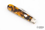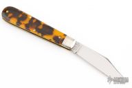 This slipjoint by Great Eastern Cutlery features a satin finished clip point blade with a nail nick. The handle has nickel silver bolsters, tortoise shell acrylic overs. Has half stop. Comes with original tube. Excellent condition. 103 made